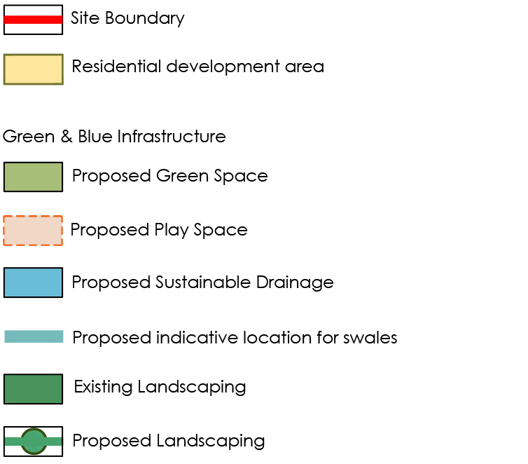 The site lies within Flood Zone 1, which is the lowest risk of flooding. The proposals incorporate Sustainable Drainage Systems (SuDS) measures which include attenuation basins, permeable paving and vegetated swales to manage surface water runoff, mitigate flooding, and support biodiversity.