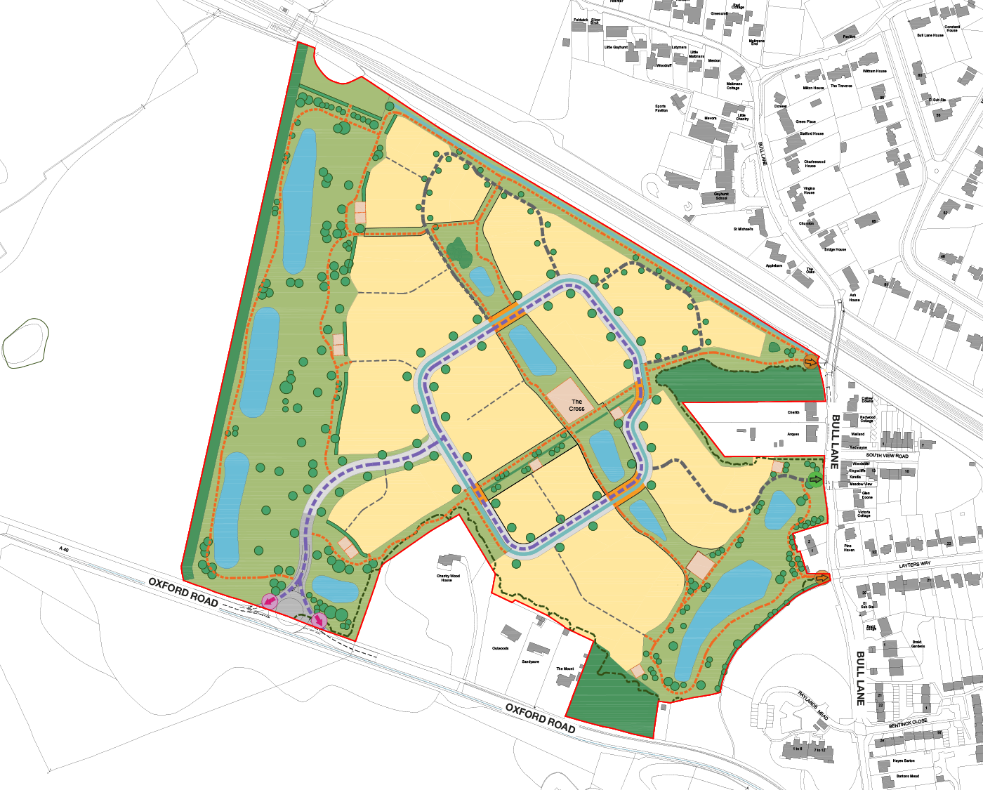 Vehicle access to the site is proposed from Oxford Road (A40) via a new three-arm priority roundabout. An emergency access link to Bull Lane is proposed to the east of the site.