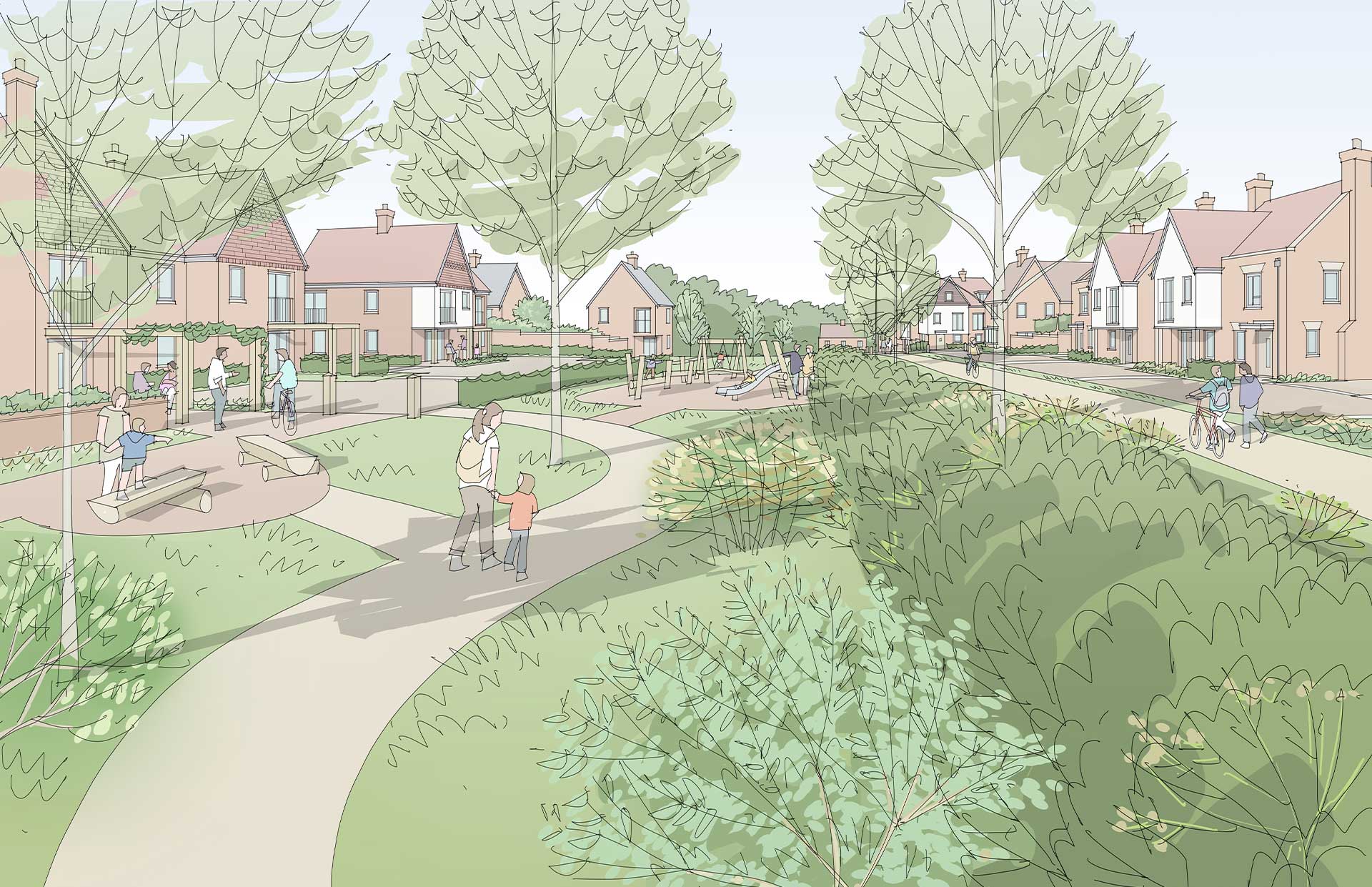 - A sustainable, landscape-led development, creating new areas of public open space for the benefit of new and existing residents including a new village green, parkland, reinstated woodland (Chantry Wood), ecological areas and biodiversity net gain improvements;